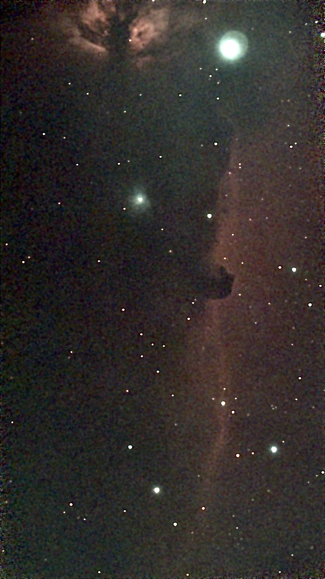 Even though this is a noisy capture, you can see that the dark Horsehead is superimposed over a brighter red glow caused by hydrogen gas ‘excited’ by the light of nearby stars. On one side the number of stars is much higher than on the other: the darker area is covered interstellar dust which blocks the light from stars in the background. There’s a lot of dust in this area, and longer exposures will reveal more details – the dust reflects a little light from nearby stars, but not enough to be seen in this short capture.